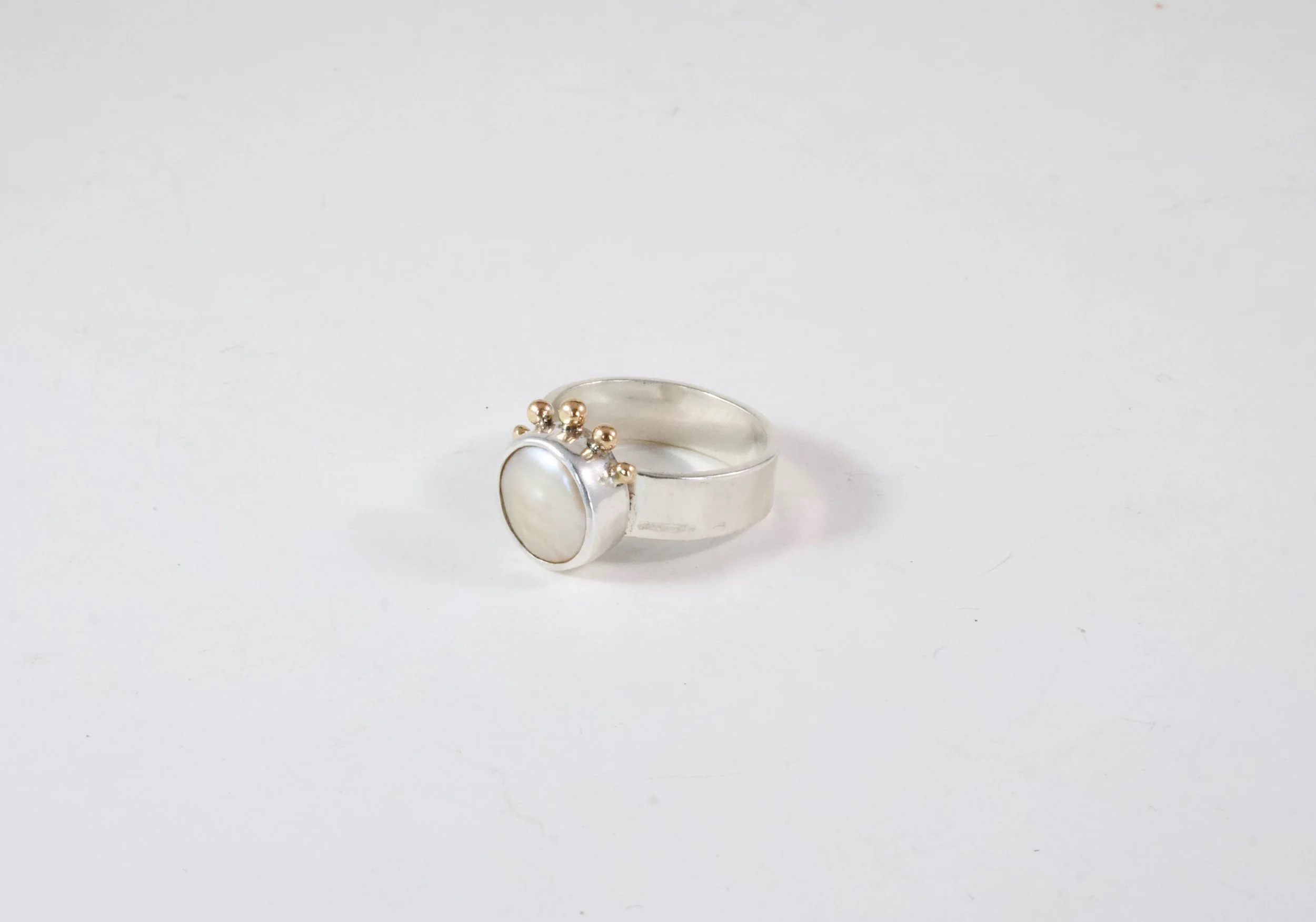Image 1 of 4 Image 2 of 4 Image 3 of 4 Image 4 of 4 Pearl Sprite Ring $90.00 sold out A soft pink pearl is dotted with a 14k gold crown. Set on a sterling silver wide band.One-of-a-kind. Size 6. Sold Out Added! A soft pink pearl is dotted with a 14k gold crown. Set on a sterling silver wide band.One-of-a-kind. Size 6.